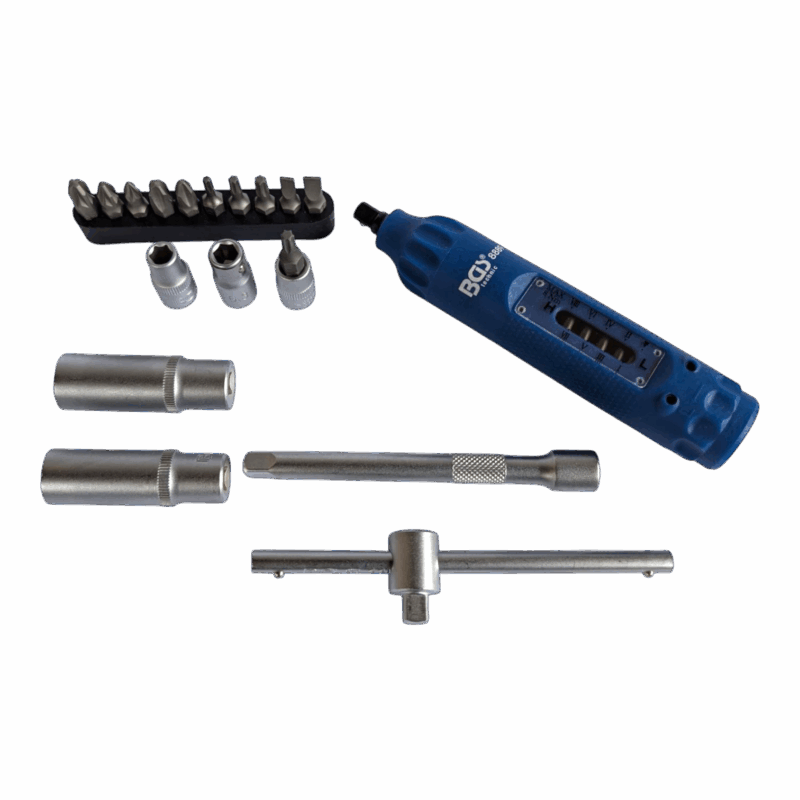 Zestaw narzędzi BGS Technic to 18-częściowy zestaw do czujników TPMS. Zawiera wkrętak dynamometryczny 1-8 Nm oraz nasadki sześciokątne, w tym głębokie, a także nasadkę do bitów profil T (Torx) T20 i adapter do bitów 6,3 mm. Zestaw jest wykonany ze stali chromowo-wanadowej